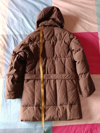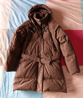 Elegante piumino da donna con cappuccio, perfetto per le giornate più fredde. Presenta una cintura che segna il punto vita. - Cappuccio integrato. - Chiusura con zip e bottoni. - Cintura in vita regolabile. - Tasche laterali con zip. Piumino donna con cappuccio e diverse tasche esterne ed interne, colore marrone, taglia S vedere misure in foto, marca Dandywear QYuko, materiale 58%nylon 42% cotone. In ottime condizioni.