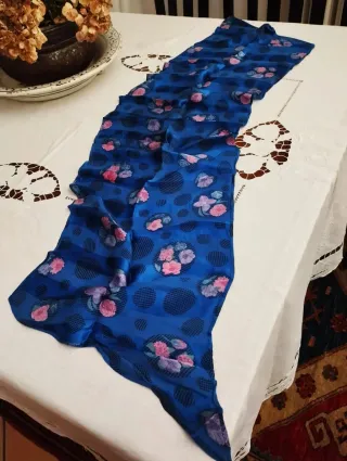 Elegante sciarpa ricavata da uno scampolo di pura seta, interamente cucita a mano, colore blu elettrico, con motivi floreali. Dimensioni cm. 110×30.