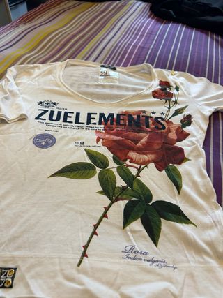 Maglietta da donna ZUELEMENTS con stampa floreale. - Maniche corte. - Scollo a V. - Stampa di rose e dettagli grafici. - Tessuto morbido.
