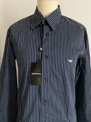 Camicia a righe da uomo, un capo classico e versatile. Tg S, marca Armani Jeans, nuova con cartellino, tessuto 80% cotone e 20% poliamide, elasticizzato, multi stagione, colore blu, righe bianche, piccolo logo ricamato, misure : spalle cm 40, larghezza cm 47, lunghezza cm 70, manica cm 64 ( cod armaverde3 cestomet) w. NY. M - Fantasia a righe verticali. - Logo ricamato sul petto.