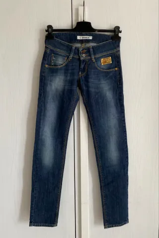 Jeans da donna a vita media con un lavaggio effetto used. Marca Tackle tg 27/ 40 IT, Made in Italy, usato ma in ottimo stato, tessuto 88% cotone e 11% elastam, elasticizzato, multi stagione, vita cm 35, fianchi 643, lunghezza cm 100 ( cod armaverde3 cestomet) w. NY. M - Chiusura con zip e bottoni. - Tasche anteriori e posteriori. - Dettaglio logo dorato sulla tasca destra.