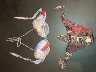 Bikini con fantasia paisley, perfetto per l'estate. - Design patchwork colorato. - Spalline e laccetti regolabili per una vestibilità personalizzata.
