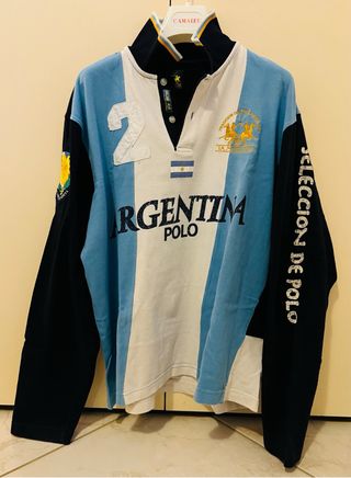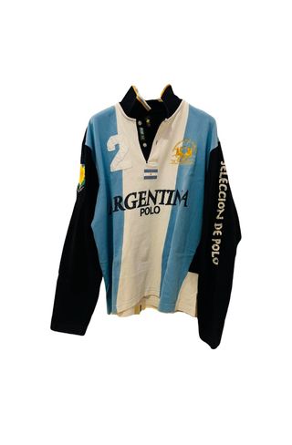 Felpa vintage La Martina, modello Polo Argentina, risalente agli anni 2000. Presenta un design a blocchi di colore con strisce azzurre e bianche. - Maniche lunghe blu scuro. - Numero 2 applicato sul petto. - Logo La Martina sul petto. - Scritta SELECCION DE POLO sul braccio destro.