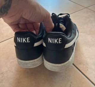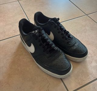 Scarpe sportive Nike Court Vision Low. - Tomaia in pelle sintetica nera. - Dettagli bianchi come lo Swoosh laterale e la suola. - Chiusura con lacci neri. - Inserti traforati sulla punta. Indossate due sole volte Prezzo trattabile