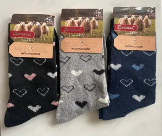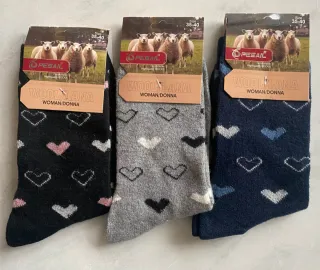 Confezione da tre paia di calze da donna. Marca Pesail, nuove con confezione originale, tessuto 80% lana, 10% angora, 5% cotone e 5% elastam Fantasia con cuori ( cod BBB) M - Taglia 35-40 - Design con cuori - Modelli in nero, grigio e blu