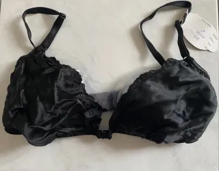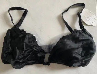 Elegante reggiseno in seta con ricami. Tg 4, marca Armelle, Made in Italy, capo Vintage, nuovo con cartellino, tessuto 100% pura seta naturale, colore nero, modello a triangolo senza imbottitura, bretelle regolabili, allacciatura davanti, dettagli ricamati, lavorato a mano, elegante e raffinato ( art 0.78 cod ZZ) NY. M - Taglia 4 (corrisponde a 95B). - Colore nero. - Dettagli ricamati sul bordo. - Spalline regolabili.