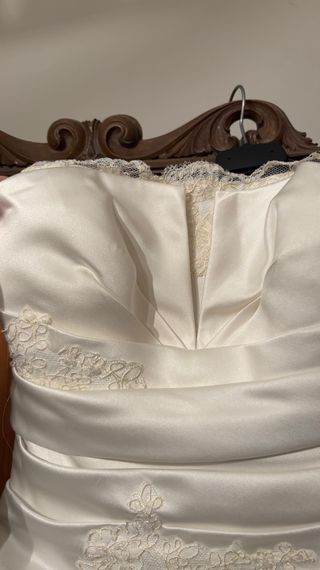 Elegante abito da sposa Mattioli, un capo unico per il tuo giorno speciale. - Tessuto in raso lucido. - Dettagli in pizzo floreale. - Corpetto drappeggiato. - Gonna a trapezio con strascico. Usato ovviamente una sola volta qualche anno fa, lavato e mai più usato. Vendo per conto dei parenti. Prezzo trattabile senza problemi.
