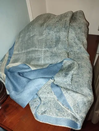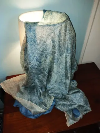 Elegante pashmina, nuova, mai indossata, made in Spagna, 50% seta, 50% viscosa, morbida e delicata, double face, doppio velo cucito, cioè due veli cuciti assieme, colore blu avio con motivi floreali bianchi, dimensioni cm. 170×50.