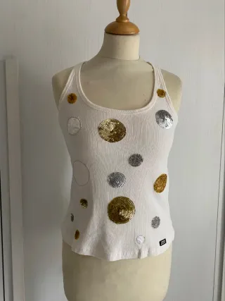 Canotta da donna Miss Sixty, taglia M. Un capo versatile con un design unico. Capo Vintage, usata ma in buono stato, dietro il tessuto presenta macchiato Tessuto trattato 100 % cotone, colore panna, ricami e bottoni applicati, spalle cm 36, larghezza cm 40, lunghezza cm 51 ( art cestomet 3) M - Stampa party trap con pipistrelli. - Dettagli con bottoncini sul davanti. - Tessuto bianco/panna.