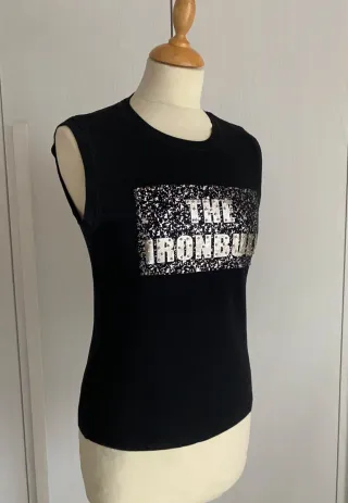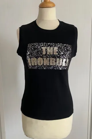 Canotta da donna VNTX con un design accattivante tg S/M, usata ma in ottimo stato, tessuto di cotone, internamente l'etichetta della taglia e della composizione è stata tagliata, colore nero, davanti motivo in rilievo argento, borchie applicate, spalle cm 33, larghezza cm 40, lunghezza cm 54 ( cod cestemet3 nero) M - Tessuto nero. - Dettagli con paillettes argento. - Scritta THE IRONBUILT sul davanti.