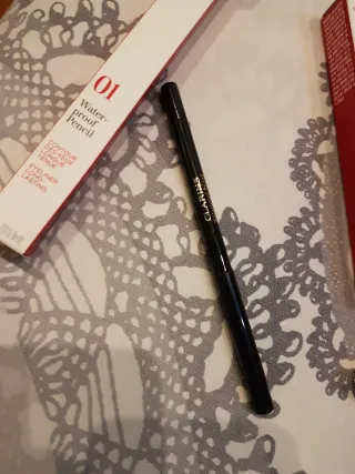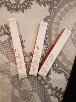 Set di prodotti Clarins per il trucco degli occhi. - Matita occhi Waterproof, lunga tenuta. - Mascara Supra Lift & Curl per ciglia sollevate e volumizzate. - SOS Lashes Serum Mascara, trattamento rivitalizzante e condizionante.
