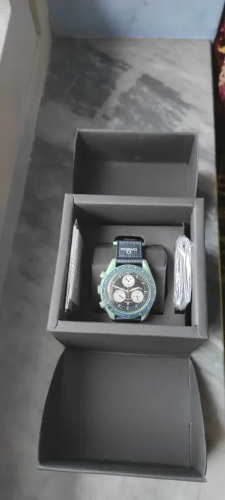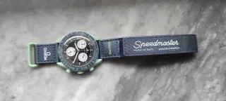 Orologio Omega Mission on Earth della collezione MoonSwatch. - Cassa in bioceramica. - Quadrante verde. - Resistente alle temperature. - Ha attività tettonica. - Ospita elementi rari.