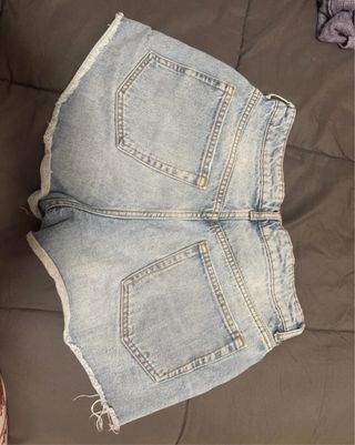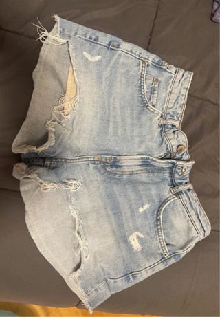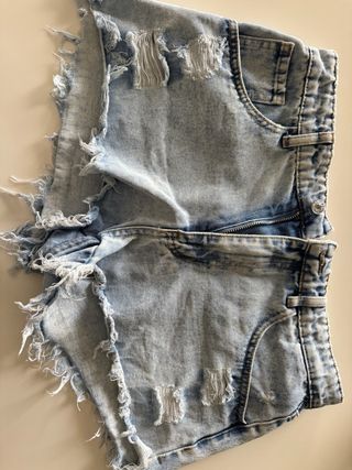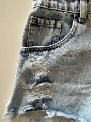 Pantaloncini in denim con un lavaggio chiaro e dettagli strappati. Perfetti per un look casual. - Vita alta. - Orlo sfrangiato. - Tasche anteriori e posteriori.