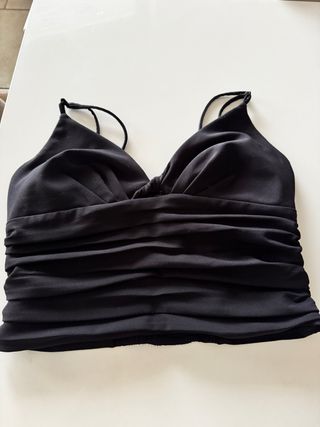 Elegante top nero con dettagli drappeggiati. - Tessuto morbido e leggero. - Spalline sottili. - Dettaglio nodo sul seno. - Fascia drappeggiata in vita.