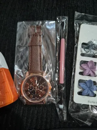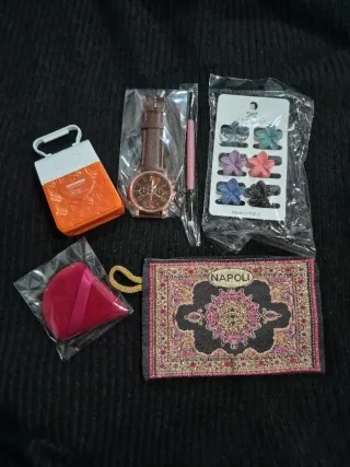 Set di accessori da donna con diversi articoli. - Orologio con cinturino marrone. - Crema idratante mani/corpo - Fermagli per capelli a forma di fiore. - Pennellino per unghie o altro - Pochette con fantasia . - Spugnetta per trucco rossa.
