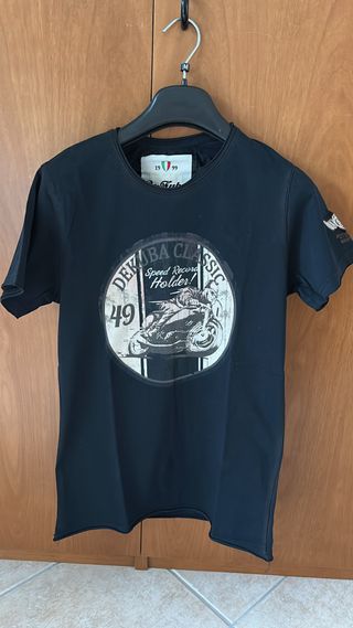 Maglietta nera con una stampa a tema motociclistico sul davanti. - Stampa DEKUBA CLASSIC SPEED RECORD HOLDER! 49. - Dettaglio con logo sul braccio destro.