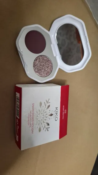 Palette per occhi Kiko Milano della collezione Snow Kissed Holiday. - Due cialde di ombretto. - Una cialda opaca color prugna. - Una cialda glitterata color rosa pesca. - Include specchietto.