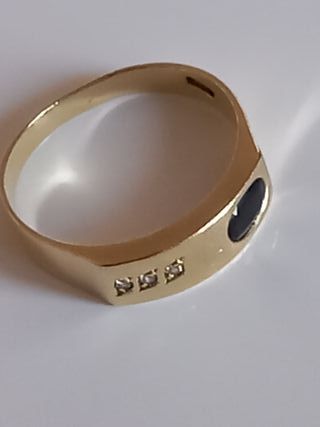 Elegante anello in oro, impreziosito da uno zaffiro nero e tre diamanti. ●●●Buonasera a tutti. Presentazione del venditore: Anello in oro giallo 750 18 karati (peso totale 3,72 g),con pietra centrale zaffiro blu taglio ovale e numero tre diamanti taglio brillante,composta da fede fidanzamento, misura mm 20.EU 60 / IT 20 / US 9, in buone condizioni con lievi segni di usura; nessuna perizia di laboratorio. Prezzo stimato € 1868,00. Vendo a soli € 850,00.. - Materiale: Oro - Pietra centrale: Zaffiro nero - Dettagli: Tre diamanti incastonati