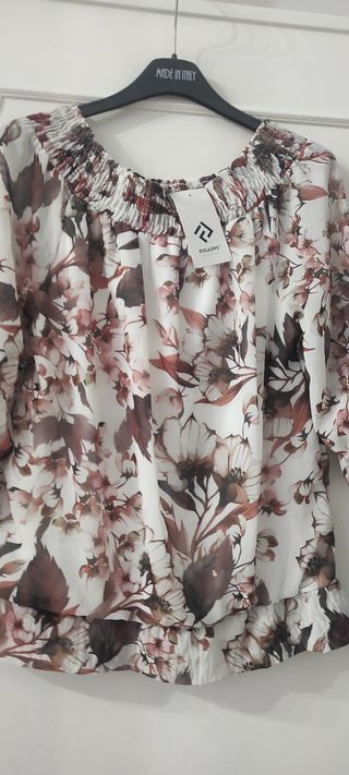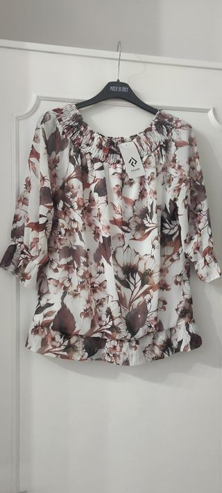 Bellissima blusa estiva a fiori, leggera e ariosa. Perfetta per le giornate calde. - Modello a maniche lunghe. - Scollo a barca. - Dettaglio con coulisse sul davanti. - Elastico in vita. - Stampa floreale romantica.