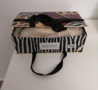 Scarpe usate ma in buone condizioni, l'unico difetto è la suola gialla, e leggermente graffiato nella parte del tallone, come si vede in foto - Tomaia in pelle bianca con dettagli dorati. - Inserti laterali traforati. - Zip decorativa sul lato.