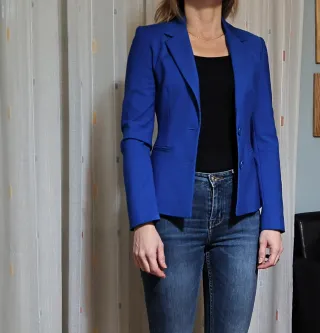 Elegante giacca da donna in un vivace colore blu royal. Un capo versatile che aggiunge un tocco di stile. - Design classico con revers. - Chiusura a due bottoni. - Tasche frontali. - Maniche lunghe.