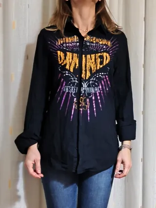 Camicia da donna GURU con una stampa accattivante sul davanti. - Maniche lunghe. - Colletto classico. - Chiusura con bottoni. - Stampa grafica colorata.