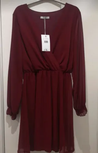Vestitino da donna, nuovo con cartellino. Colore borgogna. - Tessuto leggero e fluido. - Maniche lunghe con elastico ai polsi. - Dettaglio volant sui polsi.