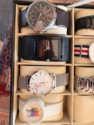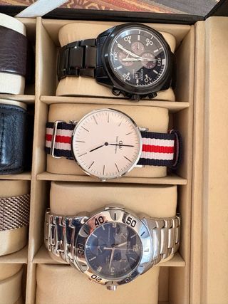 Set di orologi da polso. - Orologio Citizen nero con cinturino in metallo. - Orologio con quadrante bianco e cinturino a righe. - Orologio con quadrante blu e cinturino in metallo argentato.