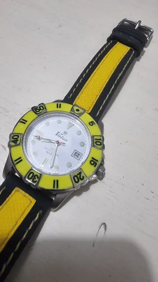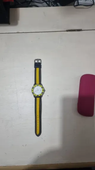 Orologio da polso con cinturino bicolore. - Lunetta girevole gialla. - Quadrante bianco con indici. - Datario. - Cinturino in tessuto nero e giallo.