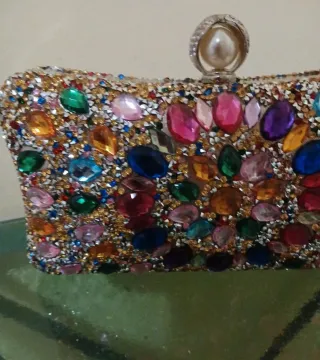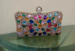 Pochette da sera, perfetta per occasioni speciali. Un accessorio che aggiunge un tocco di brillantezza. - Decorata con numerose pietre colorate. - Chiusura superiore con perla centrale.