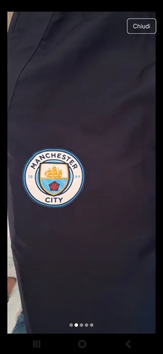 Pantaloni della tuta Puma. - Logo Puma giallo. - Stemma Manchester City sul lato sinistro. - Inserti colorati sui lati.