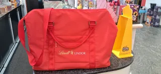 Borsone rosso con logo Lindt. - Manici superiori. - Tracolla regolabile. - Tasca frontale con zip.