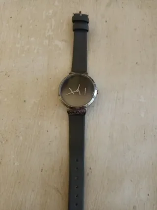 Elegante orologio da polso da donna Oleari con cinturino in pelle nera e cassa in metallo argentato. Il quadrante presenta indici luminosi e un design minimalista. - Cinturino in pelle nera. - Cassa in metallo color argento. - Dettagli luminosi sul quadrante.