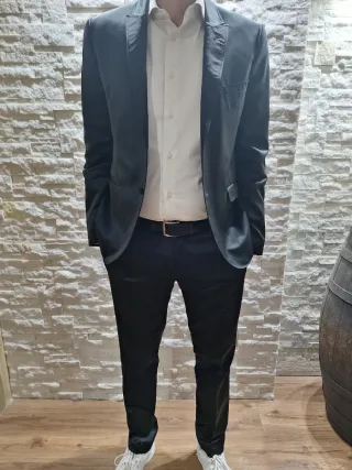 Elegante abito da uomo Dolce & Gabbana in una finitura nera lucida. La taglia corrisponde a una 52. - Tessuto con una finitura lucida distintiva. - Design classico con giacca e pantaloni.