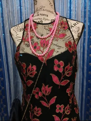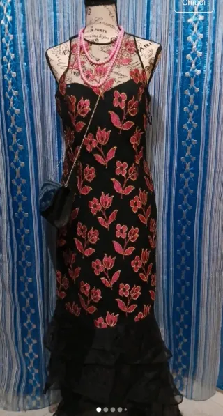 Elegante abito lungo con un motivo floreale. - Tessuto principale nero. - Dettagli floreali rosa. - Fondo con balze in tulle nero.