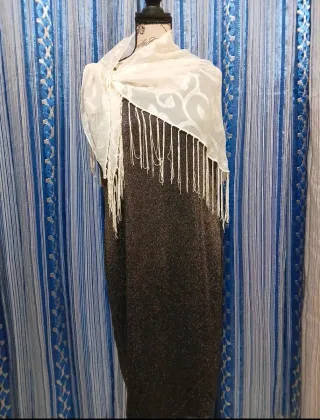 Elegante abito da donna con un design sofisticato. - Tessuto con finitura scintillante. - Stola in chiffon con frange e motivo floreale. - Taglia unica.