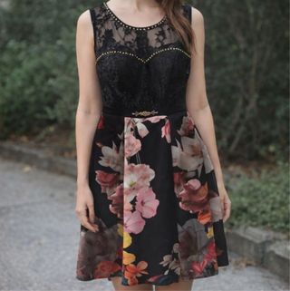 Elegante abito midi con corpetto in pizzo e gonna a fantasia floreale. - Dettagli in pizzo trasparente sul corpetto. - Fantasia floreale vivace sulla gonna. - Cintura decorativa in vita.