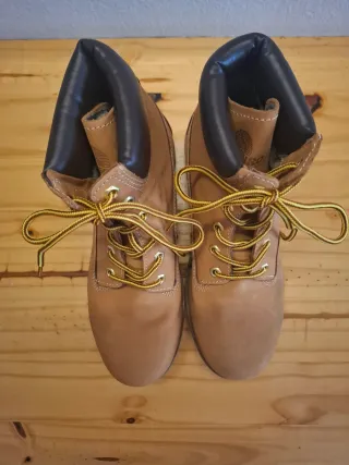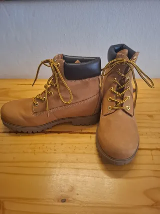 Scarponcini robusti e alla moda, perfetti per ogni occasione. - Tomaia in pelle scamosciata marrone. - Dettagli neri sul colletto. - Lacci gialli a contrasto.