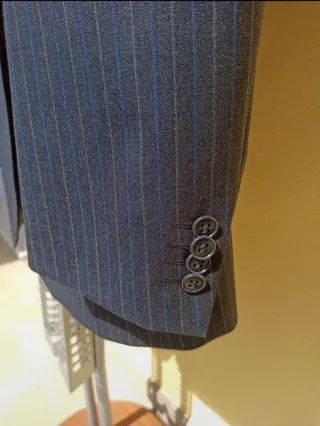 Elegante completo da uomo. - Giacca con chiusura a bottoni. - Pantaloni coordinati. - Tessuto a righe sottili. Misure: Taglia giacca 56 Lunghezza giacca 85 cm Lunghezza dalla spalla 75 cm Lunghezza manica 65 cm Lunghezza pantaloni 112 cm #completouomo #giaccauomo #pantaloniuomo #elegante #taglia56 #nero #spada #uomo #uomoelegante