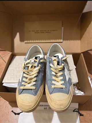 Scarpe Golden Goose Superstar in camoscio e tela. - Dettagli in pelle bianca a forma di stella. - Suola in gomma effetto vissuto. - Lacci color crema. ATTENZIONE la vestibilità di questo modello è pari a un numero 45!!!