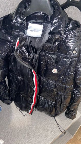 Piumino invernale Moncler in lucido. - Design trapuntato. - Dettaglio a righe rosse e bianche. - Tasche frontali con chiusura a bottone. - Logo Moncler applicato sul petto.