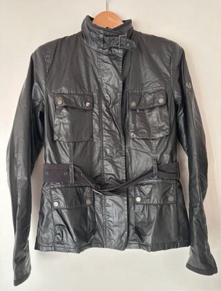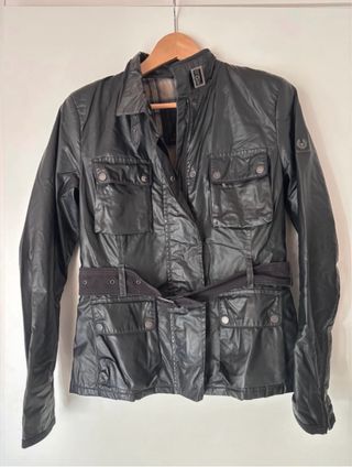 Vendo questa magnifica giacca/trench Belstaff. Dettagli Principali: • Marca: Belstaff ("A Genuine Product - The Original Since 1924") • Taglia: 40 (Vestibilità Slim Fit) • Colore: Nero lucido / Grigio scuro (il tessuto ha un aspetto cerato) • Dettagli: Logo Belstaff in metallo sulla manica sinistra e sull'etichetta interna. Chiusura con zip e automatici. • Condizioni: Ottime condizioni, come si vede dalle foto. Usata pochissimo, tenuta con cura. Nessun segno evidente di usura.