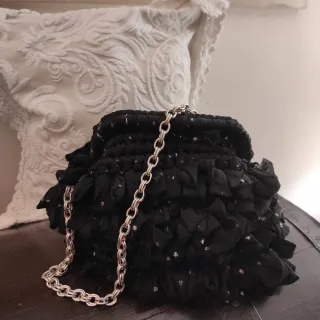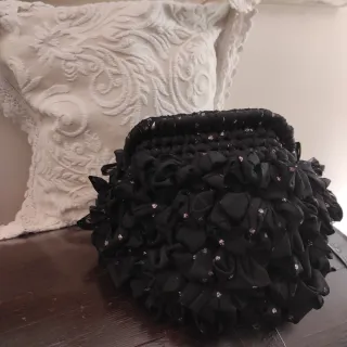 Elegante borsetta nera in fettuccia di tulle con pois in lurex argento e fodera interna. Base color argento. Lavorazione punto basso e punto pelliccia. Perfetta per ogni occasione. Dotata di una pratica catena per essere indossata. Prodotto artigianale fatto a mano. Misure: Larghezza 28 cm, Altezza 22 cm, Profondità 10cm. - Dettagli scintillanti. - Tessuto morbido e leggero.