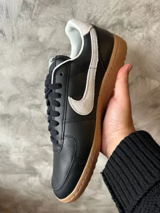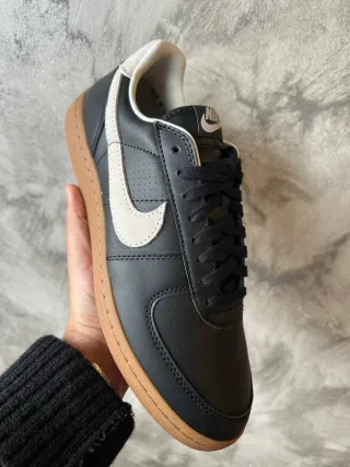 Scarpe Nike Field General 82 SP. Factory box quindi senza coperchio perché acquistata presso un outlet Nike - Tomaia in pelle nera con dettagli bianchi. - Suola in gomma color caramello. - Logo Nike sul lato e sul tallone.