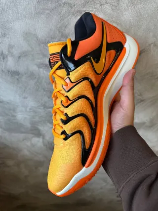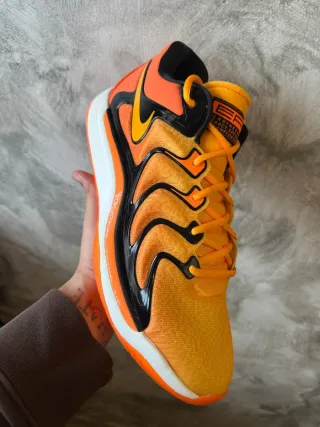Scarpe da basket Nike KD17 con un design vivace. Size 47,5 Factory box quindi senza coperchio perché acquistata presso un outlet Nike - Tomaia in mesh traspirante. - Dettagli neri lucidi. - Suola bianca e arancione.