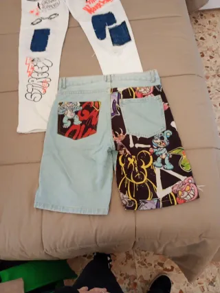 Set composto da jeans e pantaloncini. - Jeans bianchi con stampe e toppe. - Pantaloncini in denim azzurro con strappi.
