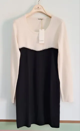Elegante abito a maniche lunghe, perfetto per ogni occasione. Colori: nero, panna. Inserti gioello. - Realizzato in lana e cashmere. Vestibilità 42 italiana.