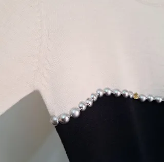 Elegante maglia nera con un dettaglio di perline sul davanti. Perfetta per aggiungere un tocco di luce al tuo outfit. - Maniche corte. - Scollo rotondo. - Decorazione centrale con perline. - Taglia L ( misure in foto)