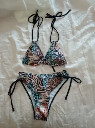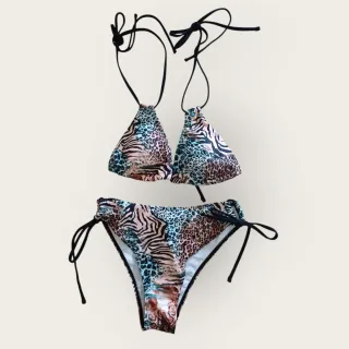 Bikini con fantasia animalier, perfetto per la spiaggia o la piscina. - Top a triangolo con laccetti e leggera imbottitura - Slip con laccetti laterali regolabili. - Tessuto confortevole.