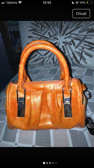Borsa a mano in ecopelle arancione, con un design unico e dettagli metallici. - Materiale: Ecopelle - Colore: Arancione - Dettagli: Inserti metallici argentati - Chiusura: Zip - Condizioni: Nuova